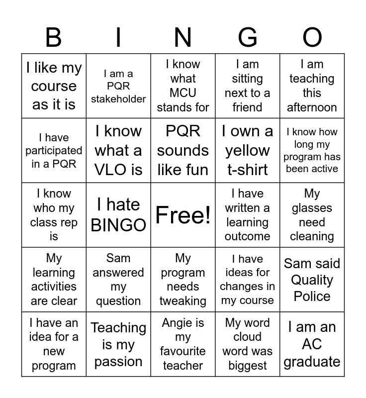 This bingo card has a free space and 28 words: Sam said Quality Police, I worked with a Curriculum Consultant, I own a yellow t-shirt, My word cloud word was biggest, I have participated in a PQR, I know what MCU stands for, I am a PQR stakeholder, My learning activities are clear, I have written a learning outcome, I have an idea for a new program, I know who my class rep is, I am sitting next to a friend, Teaching is my passion, Angie is my favourite teacher, I know how long my program has been active, I asked Maggie a question, Sam answered my question, I know what a VLO is, PQR sounds like fun, My program needs tweaking, I like my course as it is, Graduates of my program get hired, I am an AC graduate, I hate BINGO, My glasses need cleaning, I have ideas for changes in my course, I am teaching this afternoon and BINGO is awesome.