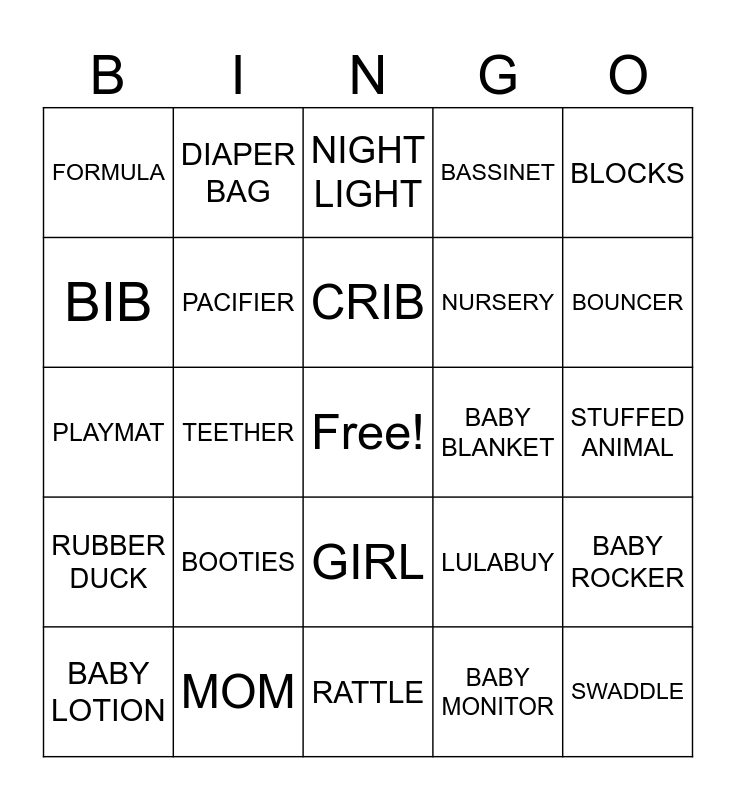 This bingo card has a free space and 35 words: STROLLER, DIAPER, BABY POWDER, PACIFIER, GIRL, BASSINET, BIB, WALKER, CRIB, BOTTLE, PLAYMAT, BLOCKS, DAD, CAR SEAT, FORMULA, BABY BLANKET, BABY MONITOR, TEETHER, RUBBER DUCK, SWADDLE, LULABUY, BABY LOTION, BABY ROCKER, MOM, NIGHT LIGHT, BOUNCER, SIPPY CUP, BURP CLOTH, NURSERY, STUFFED ANIMAL, WIPES, RATTLE, BOOTIES, DIAPER BAG and BOY.