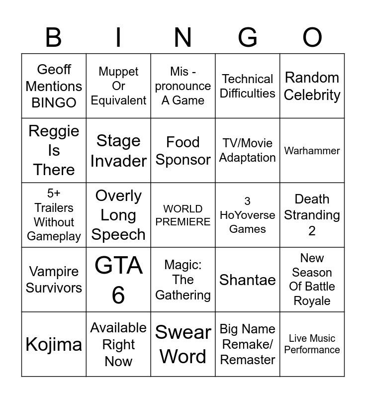 This bingo card has a free space and 24 words: GTA 6, Available Right Now, Food Sponsor, Kojima, Random Celebrity, Geoff Mentions BINGO, Reggie Is There, Muppet Or Equivalent, 3 HoYoverse Games, Magic: The Gathering, TV/Movie Adaptation, 5+ Trailers Without Gameplay, Shantae, New Season Of Battle Royale, Stage Invader, Big Name Remake/ Remaster, Death Stranding 2, Mis - pronounce A Game, Warhammer, Overly Long Speech, Live Music Performance, Vampire Survivors, Technical Difficulties and Swear Word.