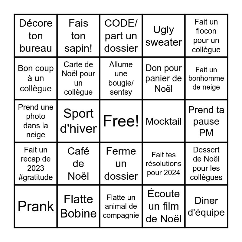 This bingo card has a free space and 24 words: Café de Noël, Flatte Bobine, Allume une bougie/ sentsy, Prank, Fait un flocon pour un collègue, Décore ton bureau, Bon coup à un collègue, Fais ton sapin!, Mocktail, Ferme un dossier, Don pour panier de Noël, Prend une photo dans la neige, Fait tes résolutions pour 2024, Dessert de Noël pour les collègues, Carte de Noël pour un collègue, Écoute un film de Noël, Prend ta pause PM, CODE/ part un dossier, Fait un bonhomme de neige, Sport d'hiver, Diner d'équipe, Fait un recap de 2023 #gratitude, Ugly sweater and Flatte un animal de compagnie.