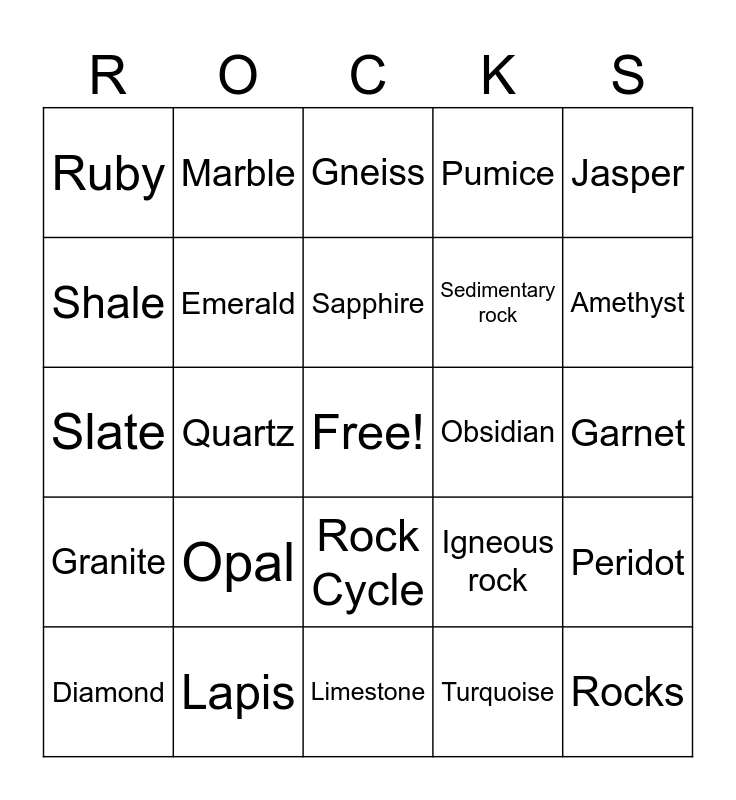 This bingo card has a free space and 27 words: Igneous rock, Metamorphic rock, Sedimentary rock, Limestone, Shale, Gneiss, Marble, Granite, Obsidian, Peridot, Slate, Pumice, Diamond, Lapis, Amethyst, Topaz, Emerald, Sapphire, Opal, Ruby, Garnet, Turquoise, Quartz, Rocks, Rock Cycle, Jasper and Gold.