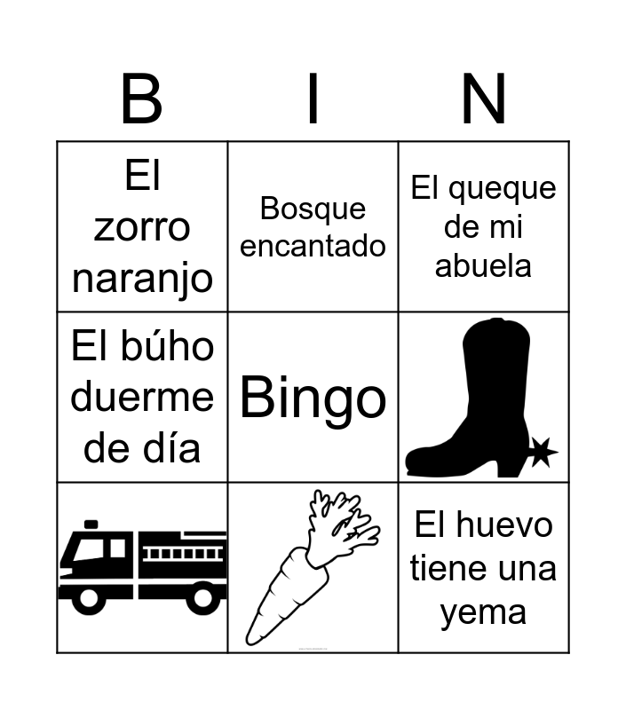 This bingo card has 3 images, a free space and 5 words: El queque de mi abuela, Bosque encantado, El zorro naranjo, El huevo tiene una yema and El búho duerme de día.