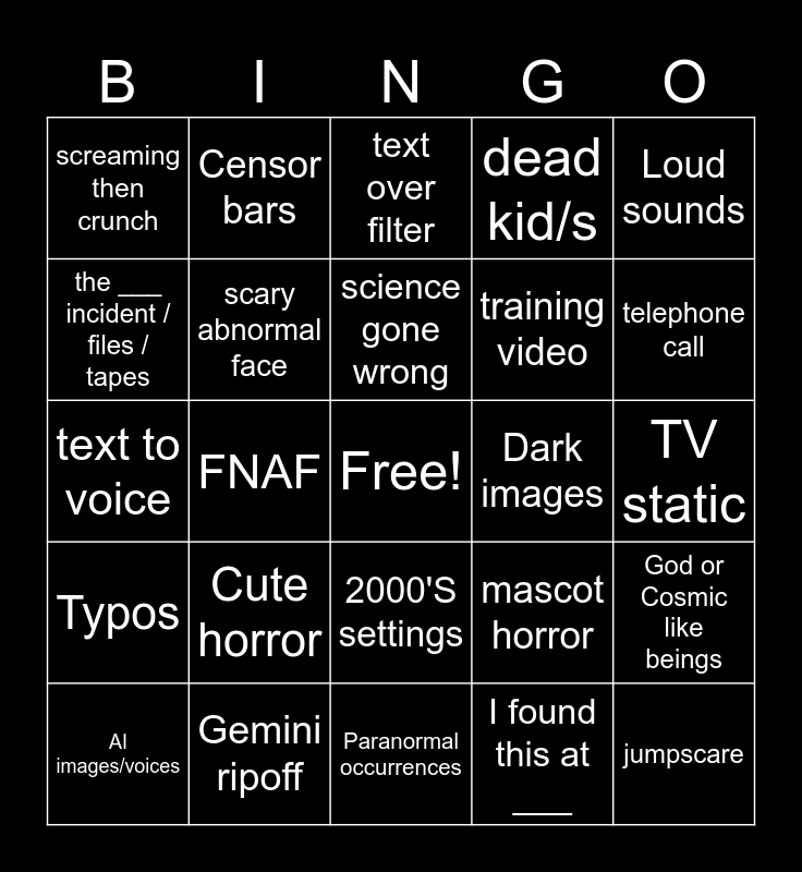 This bingo card has a free space and 75 words: Bad Vhs effect, jumpscare, text over filter, Loud sounds, bad audio mixing, text to voice, scary abnormal face, Censor bars, dead kid/s, doppelganger/skinwalker, FBI/government warning prohibited, training video, science gone wrong, the ___ incident / files / tapes, TV static, FNAF, Bad Vhs effect, jumpscare, text over filter, Loud sounds, bad audio mixing, text to voice, scary abnormal face, Censor bars, dead kid/s, doppelganger/skinwalker, FBI/government warning prohibited, broadcast interruptions, Old-timey music, Morse code, inconsistent aspect ratio, emergency sirens / emergency broadcast sound, white text on black background, mascot horror, telephone call, training video, science gone wrong, the ___ incident / files / tapes, TV static, I found this at ___, unexplained glitches, news station, clearly a teenager doing an adult voice, boring car ride scene, religious aspect, analog to live action, AI images/voices, screaming then crunch, Mandela rip off, local 58 rip off, big lab/corp, 2000'S settings, puppets, wall of text, CGI passing off as live action, VCR OCD font, go/stay inside now, Spooky eyeballs, Hidden text/link, bad voice acting, Cute horror, Slideshow horror, Transformation horror, Distorted Audio, Door knocking, Dark images, Redacted, Zombie, Parasites, God or Cosmic like beings, Typos, Gemini ripoff, PSA, Paranormal occurrences and FNAF.