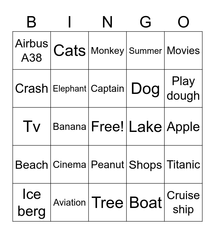 This bingo card has a free space and 30 words: Aviation, Tomato, Banana, Potato, Airbus A38, Monkey, Elephant, Peanut, Lake, Tree, Apple, Cruise ship, Boat, Tiger, Play dough, Play, Shops, Beach, Cinema, Movies, Tv, Submarine, Cats, Dog, Crash, Summer, Titanic, Ice berg, Captain and Wreck.