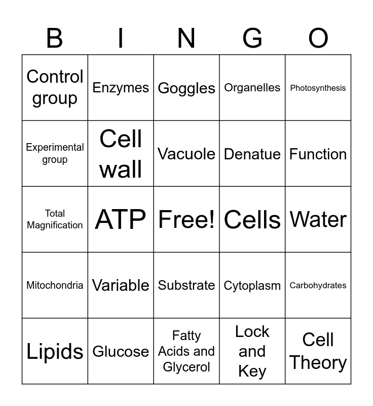 This bingo card has a free space and 36 words: Ribosomes, Nucleus, Cell membrane, Cell wall, Cytoplasm, Mitochondria, Vacuole, Chloroplast, Photosynthesis, DNA, ATP, Organelles, Synthesis, Cells, Function, Control group, 1, Variable, Cell Theory, Goggles, Water, Carbohydrates, Glucose, Lipids, Fatty Acids and Glycerol, Enzymes, Total Magnification, pH and Temperature, Denatue, Experimental group, Bonds, Reused, Lock and Key, Substrate, Active site and Fine adjustment.
