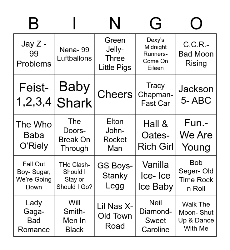 This bingo card has 37 words: Ace of Base- The Sign, Alice Cooper- School’s Out, Arrested Development, Baby Shark, Bob Seger- Old Time Rock n Roll, THe Clash- Should I Stay or Should I Go?, Cheers, The Champs- Tequila, C.C.R.- Bad Moon Rising, Dr. Dre- Nothin’ But a G Thang, The Doors- Break On Through, Dexy’s Midnight Runners- Come On Eileen, Elton John- Rocket Man, Fun.- We Are Young, Feist- 1,2,3,4, Fall Out Boy- Sugar, We’re Going Down, Gnarls Barkley- Crazy, Green Jelly- Three Little Pigs, GS Boys- Stanky Legg, Hall & Oates- Rich Girl, Jay Z - 99 Problems, Jackson 5- ABC, Lady Gaga- Bad Romance, Lil Nas X- Old Town Road, MC Hammer- Too Legit To Quit, Neil Diamond- Sweet Caroline, Nena- 99 Luftballons, Peaches & Herb- Shake Your Groove Thing, The Ramones- I Wanna Be Sedated, Semisonic- Closing Time, The X Files, Will Smith- Men In Black, The Who Baba O’Riely, Walk The Moon- Shut Up & Dance With Me, Vanilla Ice- Ice Ice Baby, Tracy Chapman- Fast Car and Sublime- Smoke Two Joints.
