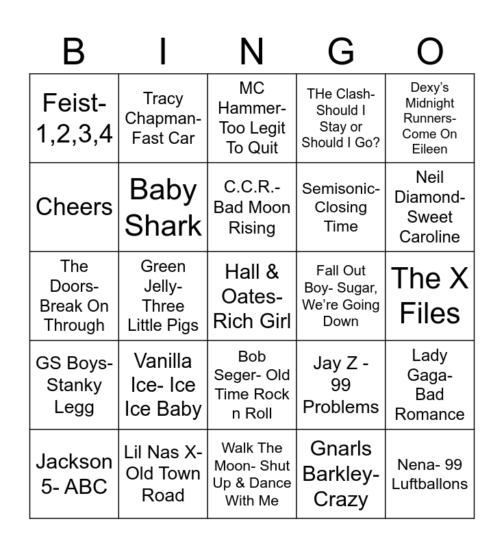 This bingo card has 35 words: ce of Base- The Sign, Alice Cooper- School’s Out, Arrested Development, Baby Shark, Bob Seger- Old Time Rock n Roll, THe Clash- Should I Stay or Should I Go?, Cheers, The Champs- Tequila, C.C.R.- Bad Moon Rising, Dr. Dre- Nothin’ But a G Thang, The Doors- Break On Through, Dexy’s Midnight Runners- Come On Eileen, Elton John- Rocket Man, Fun.- We Are Young, Feist- 1,2,3,4, Fall Out Boy- Sugar, We’re Going Down, Gnarls Barkley- Crazy, Green Jelly- Three Little Pigs, GS Boys- Stanky Legg, Hall & Oates- Rich Girl, Jay Z - 99 Problems, Jackson 5- ABC, Lady Gaga- Bad Romance, Lil Nas X- Old Town Road, MC Hammer- Too Legit To Quit, Neil Diamond- Sweet Caroline, Nena- 99 Luftballons, The Ramones- I Wanna Be Sedated, Semisonic- Closing Time, The X Files, The Who Baba O’Riely, Walk The Moon- Shut Up & Dance With Me, Vanilla Ice- Ice Ice Baby, Tracy Chapman- Fast Car and Sublime- Smoke Two Joints.