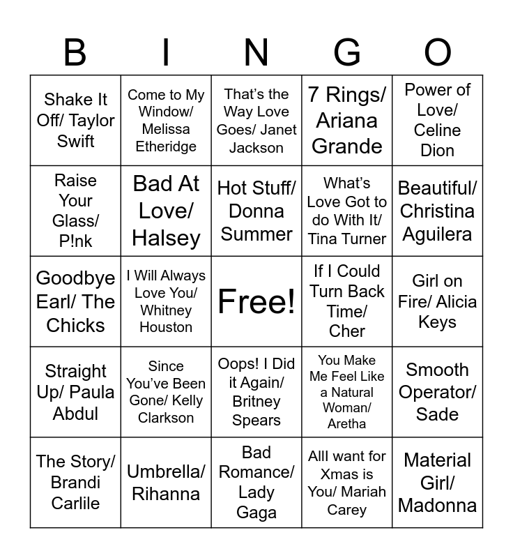 This bingo card has a free space and 52 words: Rumor Has It/ Adele, Material Girl/ Madonna, Turpentine/ Brandi Carlile, Bad Romance/ Lady Gaga, Since You’ve Been Gone/ Kelly Clarkson, Party in the USA/ Miley Cyrus, Come to My Window/ Melissa Etheridge, The 1st Cut is the Deepest/ Sheryl Crow, Raise Your Glass/ P!nk, Brave/ Sara Bareillis, Bad At Love/ Halsey, Love is a Battlefield/ Pat Benatar, Smooth Operator/ Sade, You Make Me Feel Like a Natural Woman/ Aretha, Lose Control/ Missy Elliott, Levitating/ Dua Lipa, Hot Stuff/ Donna Summer, If I Could Turn Back Time/ Cher, Jolene/ Dolly Parton, Power of Love/ Celine Dion, I Will Always Love You/ Whitney Houston, AllI want for Xmas is You/ Mariah Carey, Shake It Off/ Taylor Swift, What’s Love Got to do With It/ Tina Turner, Upside Down/ Diana Ross, Crazy In Love/ Beyonce, RESPECT/ Aretha Franklin, Firework/ Katy Perry, Beautiful/ Christina Aguilera, Rehab/ Amy Winehouse, Conga/ Gloria Estefan, 7 Rings/ Ariana Grande, Family Affair/ Mary J Blige, Girls Just Wanna Have Fun/ Cyndi Lauper, On the Floor/ Jennifer Lopez, That’s the Way Love Goes/ Janet Jackson, Umbrella/ Rihanna, Physical/ Olivia Newton-John, The Way We Were/ Barbra Streisand, Top of the World/ Karen Carpentar, Rockin’ Around the Xmas Tree/ Brenda Lee, Girl on Fire/ Alicia Keys, Straight Up/ Paula Abdul, Man! I Feel Like a Woman!/ Shania Twain, Oops! I Did it Again/ Britney Spears, You’re So Vain/ Carly Simon, Coal Miner's Daughter/ Loretta Lynn, Goodbye Earl/ The Chicks, 9 to 5/ Dolly Parton, Before He Cheats/ Carrie Underwood, The Story/ Brandi Carlile and Fancy/ Reba McEntire.