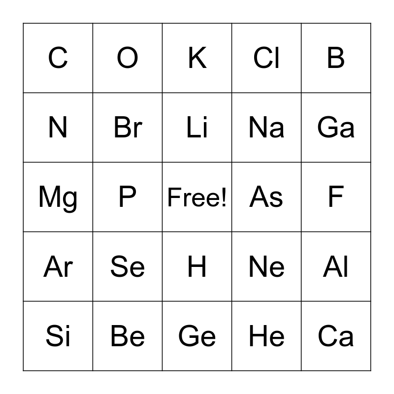 This bingo card has a free space and 26 words: H, He, Li, Be, B, C, N, O, F, Ne, Na, Mg, Al, Si, P, S, Cl, Ar, K, Ca, Ga, Ge, As, Se, Br and Kr.