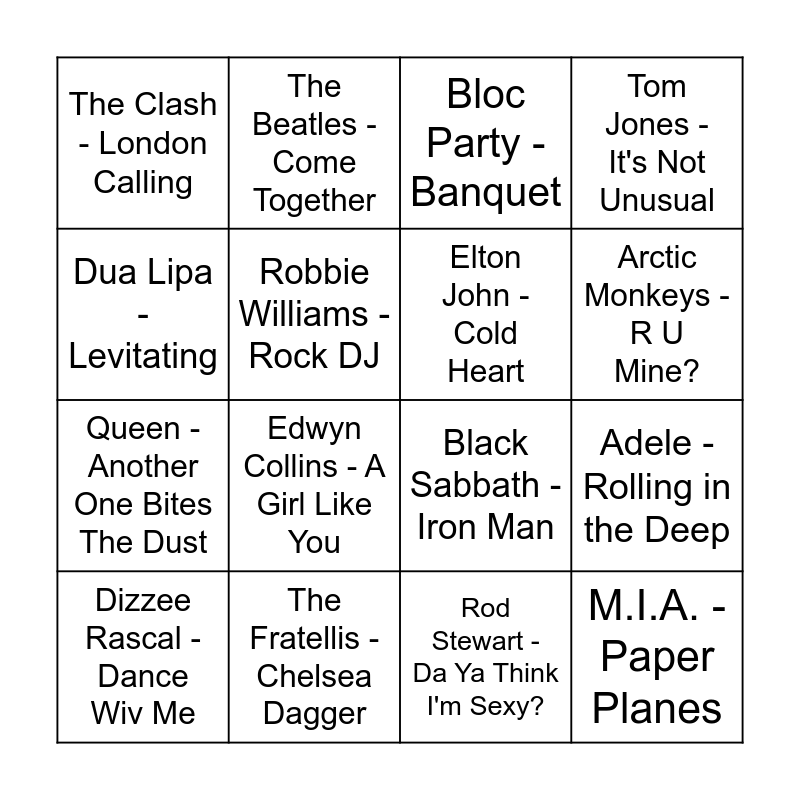 This bingo card has 60 words: Franz Ferdinand - Take Me Out, The Kooks - Naive, Foals - My Number, M.I.A. - Paper Planes, Azealia Banks - 212, Spice Girls - Stop, Elton John - Cold Heart, Oasis - Don't Look Back in Anger, Queen - Another One Bites The Dust, David Bowie - Golden Years, Tom Jones - It's Not Unusual, Gorillaz - Clint Eastwood, Robbie Williams - Rock DJ, Donna Lewis - I Love You Always Forever, Amy Winehouse - Rehab, The Clash - London Calling, Dizzee Rascal - Dance Wiv Me, Dua Lipa - Levitating, Blur - Song 2 - 2012 Remaster, Arctic Monkeys - R U Mine?, The Fratellis - Chelsea Dagger, Bloc Party - Banquet, Mylo - Drop the Pressure, Lily Allen - Not Fair, Florence + The Machine - Dog Days Are Over, Eurythmics - Sweet Dreams (Are Made of This), Kaiser Chiefs - Ruby, The Smiths - How Soon Is Now?, Edwyn Collins - A Girl Like You, Coldplay - Yellow, Duran Duran - Girls on Film, The Cure - Friday I'm In Love, Led Zeppelin - Immigrant Song, The Who - Baba O'Riley, The Beatles - Come Together, George Michael - Faith - Remastered, Harry Styles - As It Was, Adele - Rolling in the Deep, The Proclaimers - I'm on My Way, Black Sabbath - Iron Man, Melanie C - Never Be The Same Again, Ed Sheeran - Shape of You, Rod Stewart - Da Ya Think I'm Sexy?, ZAYN - PILLOWTALK, Seal - Kiss from a Rose, Cat Stevens - Wild World, Sade - Smooth Operator, The Police - Roxanne, Dexys Midnight Runners - Come On Eileen, Charli XCX - Boom Clap, Pink Floyd - Another Brick in the Wall, Stormzy - Vossi Bop, Van Morrison- Gloria, Joe Cocker - You Can Leave Your Hat On, Keane - Somewhere Only We Know, James Blunt - Goodbye My Lover, Robert Palmer - Bad Case Of Loving You, Def Leppard - Pour Some Sugar On Me, Billy Ocean - Love Really Hurts Without You and Rex Orange County - Best Friend.