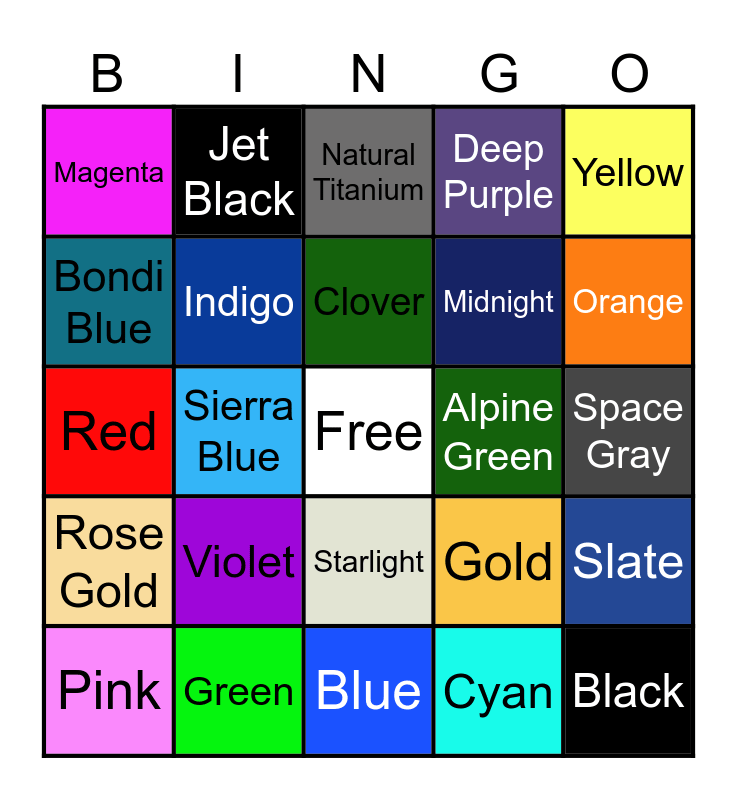 This bingo card has a free space and 24 words: Violet, Green, Clover, Pink, Yellow, Magenta, Bondi Blue, Jet Black, Alpine Green, Starlight, Midnight, Red, Gold, Slate, Indigo, Cyan, Space Gray, Natural Titanium, Orange, Sierra Blue, Black, Rose Gold, Deep Purple and Blue.