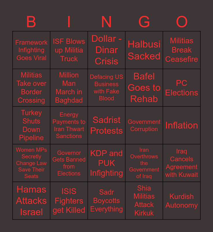 This bingo card has a free space and 24 words: Governor Gets Banned from Elections, ISIS Fighters get Killed, Defacing US Business with Fake Blood, Hamas Attacks Israel, Militias Break Ceasefire, Framework Infighting Goes Viral, Militias Take over Border Crossing, ISF Blows up Militia Truck, Government Corruption, KDP and PUK Infighting, Bafel Goes to Rehab, Turkey Shuts Down Pipeline, Iran Overthrows the Government of Iraq, Iraq Cancels Agreement with Kuwait, Million Man March in Baghdad, Shia Militias Attack Kirkuk, Inflation, Dollar -Dinar Crisis, PC Elections, Energy Payments to Iran Thwart Sanctions, Kurdish Autonomy, Women MPs Secretly Change Law Save Their Seats, Halbusi Sacked and Sadr Boycotts Everything.