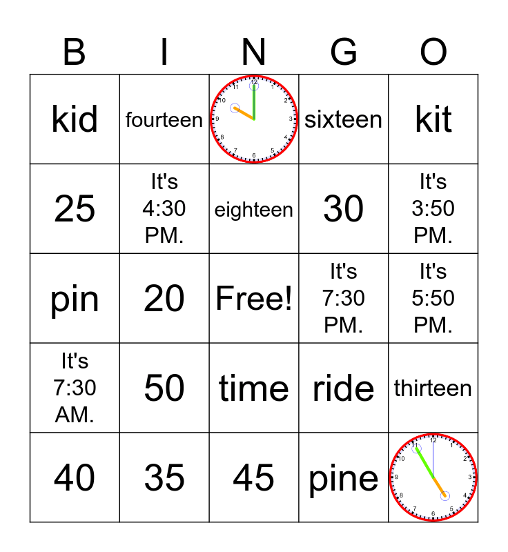This bingo card has 2 images, a free space and 27 words: 40, kite, 20, win, kid, It's 4:30 PM., 50, It's 7:30 PM., 35, It's 5:50 PM., 45, pine, It's 3:50 PM., 15, time, It's 7:30 AM., kit, pin, ride, wine, 30, 25, sixteen, fourteen, thirteen, eighteen and seventeen.