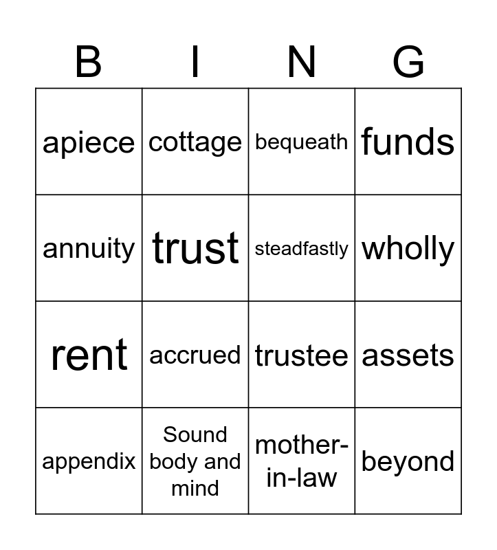 This bingo card has 16 words: Sound body and mind, assets, bequeath, apiece, rent, cottage, trustee, mother-in-law, annuity, trust, appendix, funds, accrued, wholly, steadfastly and beyond.