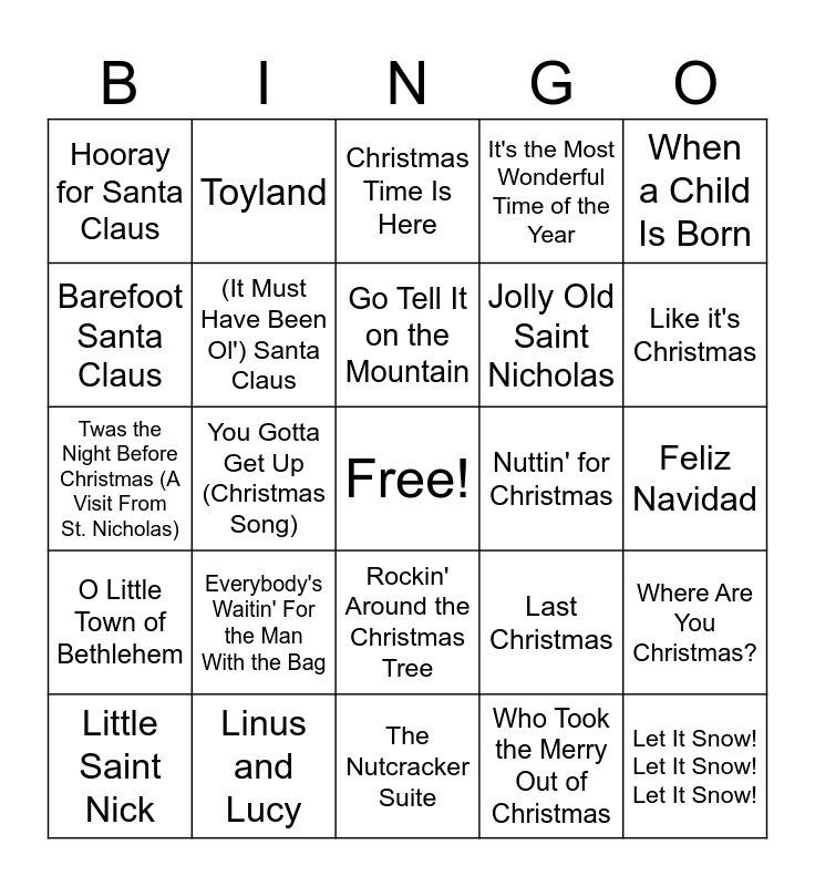 This bingo card has a free space and 56 words: Run Rudolph Run, Little Saint Nick, The Little Drummer Boy, Hooray for Santa Claus, The Nutcracker Suite, This Christmas, (It Must Have Been Ol') Santa Claus, Caroling, Caroling, Jolly Old Saint Nicholas, Sleigh Ride, It's the Most Wonderful Time of the Year, The Merry Christmas Polka, It's Christmas Once Again, Blue Christmas, Parade of the Wooden Soldiers, Santa Claus Is Comin' to Town, When a Child Is Born, You Gotta Get Up (Christmas Song), Dominick the Donkey (The Italian Christmas Donkey), Let It Snow! Let It Snow! Let It Snow!, Nuttin' for Christmas, Mele Kalikimaka, Last Christmas, Christmas Time Is Here, The Happy Elf, Go Tell It on the Mountain, Baby, It's Cold Outside, Hark! the Herald Angels Sing, Like it's Christmas, It's Beginning to Look a Lot Like Christmas, Hey Santa!, Christmas Is Coming, Please Come Home for Christmas, Do You Want to Build a Snowman?, Feliz Navidad, Barefoot Santa Claus, Twas the Night Before Christmas (A Visit From St. Nicholas), Marshmallow World, O Little Town of Bethlehem, Toyland, Rockin' Around the Christmas Tree, Angels We Have Heard on High, O Come All Ye Faithful, The Twelve Days of Christmas, Away in a Manger, Everybody's Waitin' For the Man With the Bag, Linus and Lucy, O Holy Night, Suzy Snowflake, Christmas (Baby Please Come Home), Who Took the Merry Out of Christmas, What Are You Doing New Year's Eve?, The Christmas Song (Merry Christmas to You), Christmas Vacation, Where Are You Christmas? and Christmas Island.