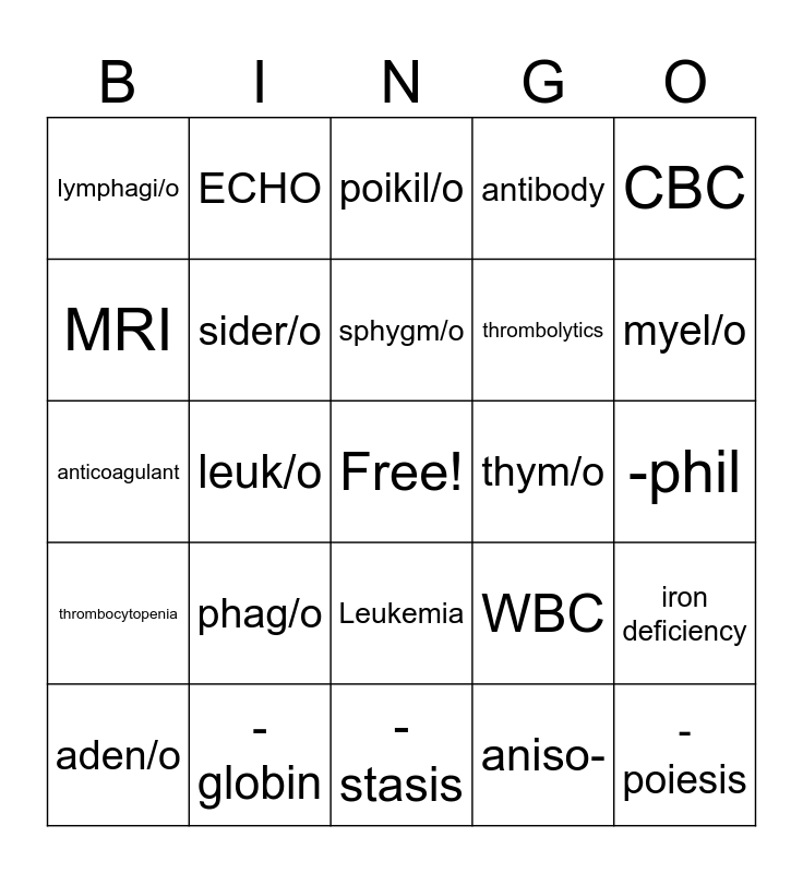 This bingo card has a free space and 29 words: aden/o, chrom/o, leuk/o, blast/o, lymphagi/o, poikil/o, sider/o, phag/o, thym/o, -globin, -phil, -poiesis, -stasis, aniso-, myel/o, AIDS, Leukemia, thrombocytopenia, CBC, anticoagulant, WBC, Hb, thrombolytics, MRI, antibody, ECHO, iron deficiency, sphygm/o and -phylaxis.