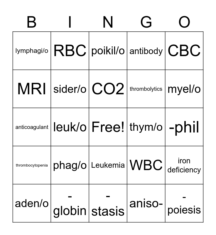 This bingo card has a free space and 29 words: aden/o, chrom/o, leuk/o, blast/o, lymphagi/o, poikil/o, sider/o, phag/o, thym/o, -globin, -phil, -poiesis, -stasis, aniso-, myel/o, AIDS, Leukemia, thrombocytopenia, CBC, anticoagulant, WBC, Hb, thrombolytics, MRI, antibody, RBC, iron deficiency, CO2 and -phylaxis.