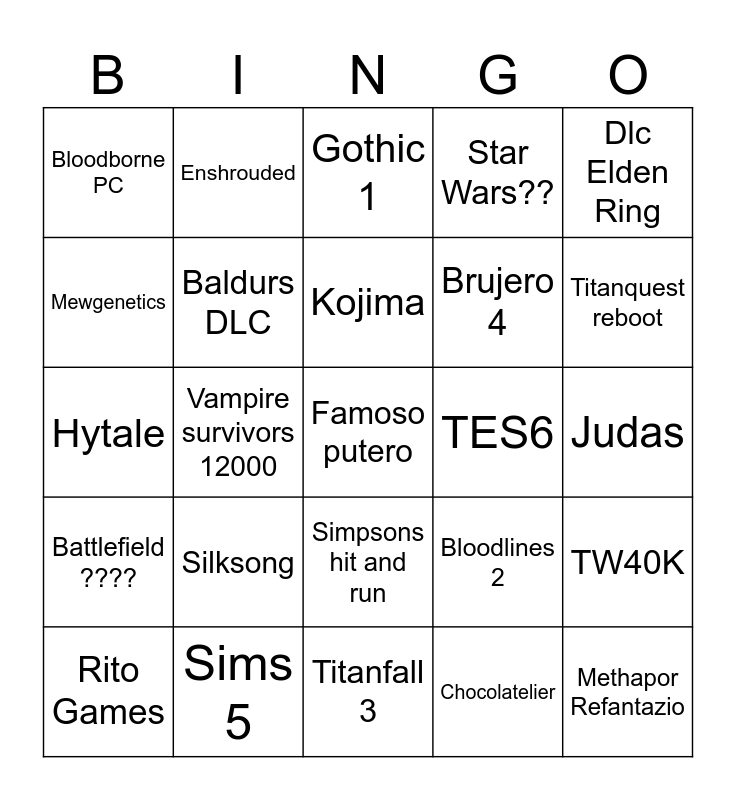 This bingo card has a free space and 24 words: Silksong, Sims 5, Kojima, Rito Games, Dlc Elden Ring, Bloodborne PC, Mewgenetics, Enshrouded, TES6, Simpsons hit and run, Brujero 4, Hytale, Bloodlines 2, TW40K, Baldurs DLC, Chocolatelier, Judas, Gothic 1, Titanquest reboot, Vampire survivors 12000, Methapor Refantazio, Battlefield ????, Star Wars?? and Titanfall 3.