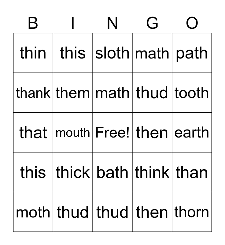 This bingo card has a free space and 24 words: thick, thud, math, moth, path, thin, thank, this, then, bath, thud, that, think, than, them, then, earth, sloth, tooth, mouth, thorn, this, math and thud.