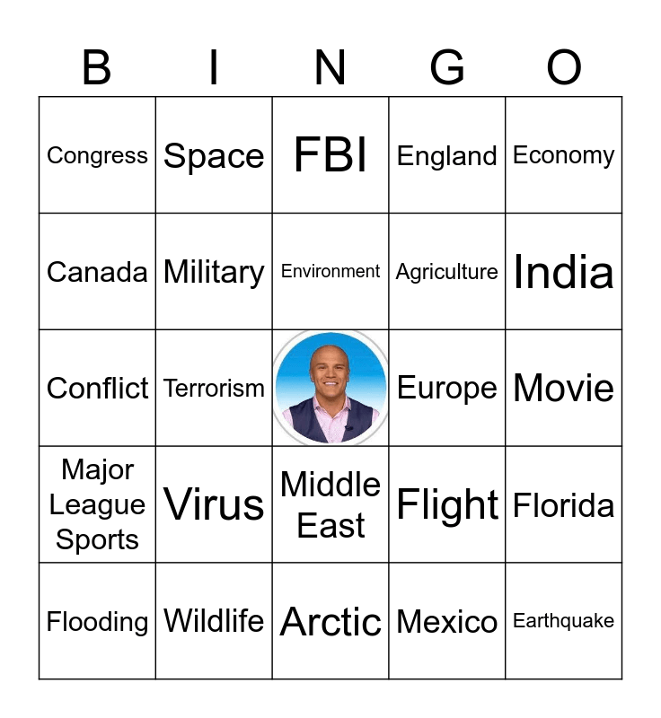 This bingo card has a free space and 60 words: United Nations, Wildlife, Japan, Major League Sports, Mexico, Michigan, Military, NASA, Agriculture, Africa, England, California, Canada, China, Colorado, Congress, Earthquake, Economy, Election, Environment, Europe, FBI, Flooding, Florida, Food, Gas/Fuel, Hero, Immigration, India, Iran, Germany, Oceans, Prime Minister, Russia, Space, Supreme Court, Texas, Terrorism, Ukraine, Conflict, Union, Virus, Movie, Dog, Flight, Leader, Emergency, Artificial Intelligence, Climate, Middle East, Arctic, CEO, Hawaii, Migration, Crisis, Billion, Bacteria, Technology, Social Media and War.