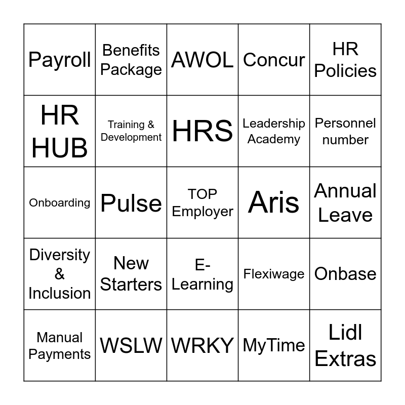 This bingo card has 25 words: New Starters, WRKY, HRS, Manual Payments, HR Policies, Payroll, HR HUB, Benefits Package, Aris, E-Learning, Leadership Academy, Onboarding, Flexiwage, Onbase, Training & Development, Lidl Extras, Annual Leave, AWOL, Personnel number, Pulse, TOP Employer, WSLW, Diversity & Inclusion, Concur and MyTime.
