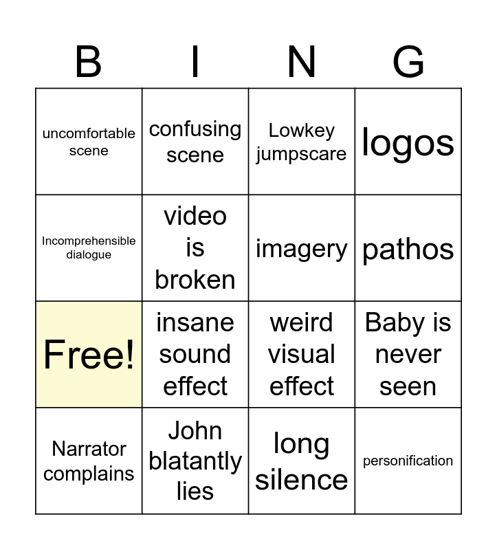 This bingo card has 20 words: Baby is never seen, Wallpaper shot, Lowkey jumpscare, Narrator is gaslit, Narrator complains, Incomprehensible dialogue, John blatantly lies, uncomfortable scene, Free!, confusing scene, insane sound effect, weird visual effect, video is broken, personification, imagery, ethos, pathos, logos, long silence and narrator grabs someone.