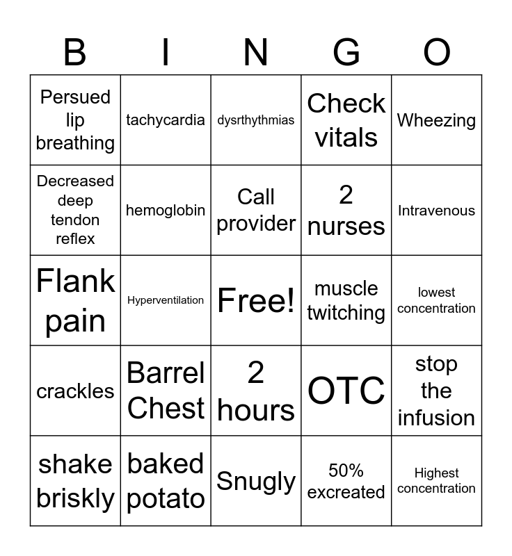 This bingo card has a free space and 30 words: baked potato, Air embolism, Hyperventilation, COPD, Persued lip breathing, dysrthythmias, hemoglobin, 2 hours, muscle twitching, Snugly, lowest concentration, Highest concentration, 50% excreated, Upright, Intravenous, warm fluid, OTC, crackles, Barrel Chest, Wheezing, Flank pain, Metabolic alkalosis, tachycardia, 2 nurses, Decreased deep tendon reflex, Check vitals, stop the infusion, shake briskly, Call provider and Pleural effusion.