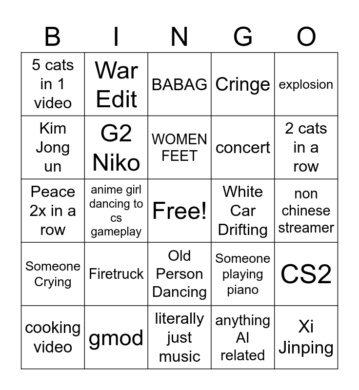 This bingo card has a free space and 24 words: Firetruck, gmod, WOMEN FEET, cooking video, explosion, 5 cats in 1 video, Kim Jong un, War Edit, White Car Drifting, Old Person Dancing, concert, Peace 2x in a row, Someone playing piano, CS2, G2 Niko, anything AI related, non chinese streamer, BABAG, 2 cats in a row, anime girl dancing to cs gameplay, Xi Jinping, Someone Crying, Cringe and literally just music.