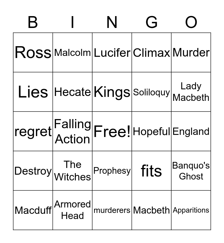 This bingo card has a free space and 24 words: The Witches, Armored Head, Kings, Macduff, Murder, Ross, Lies, Malcolm, Hopeful, Prophesy, Soliloquy, regret, fits, Banquo's Ghost, Hecate, Macbeth, England, Lucifer, Lady Macbeth, Falling Action, Apparitions, Destroy, Climax and murderers.