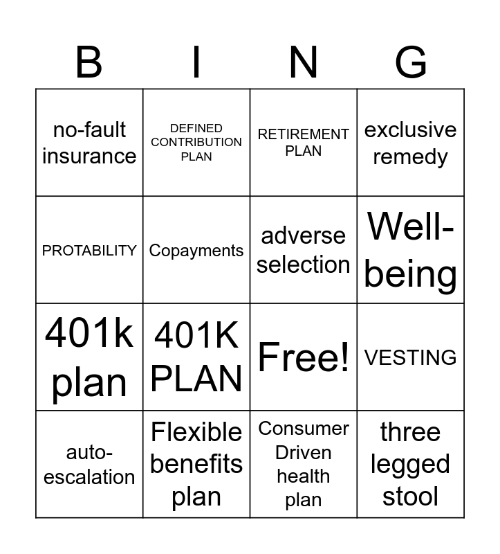 This bingo card has 21 words: Flexible benefits plan, workers' compensation, DEFINED CONTRIBUTION PLAN, Managed Care, Consumer Driven health plan, adverse selection, no-fault insurance, RETIREMENT PLAN, Free!, Well-being, 401k plan, exclusive remedy, three legged stool, Stock Purchase Plan, Copayments, auto-enrollment, auto-escalation, 401K PLAN, PROTABILITY, VESTING and DEFINED BENEFIT PLAN.