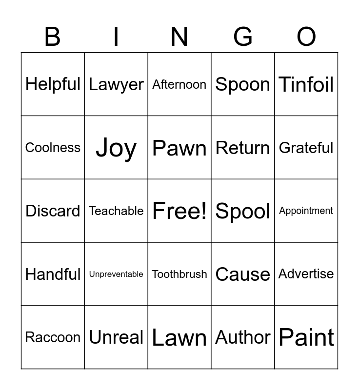 This bingo card has a free space and 112 words: Food, Soon, Feed, Flirt, Broom, Flow, Spoon, Brain, Smooth, Choose, Sport, Tooth, Rooster, Scooter, Moonlight, Cartoon, Toothbrush, Schoolroom, Teaspoon, Shampoo, Raccoon, Afternoon, Unlock, Distrust, Agreeable, Handful, Unreal, Discard, Dismay, Unchain, Helpful, Teachable, Drinkable, Faithful, Unthinkable, Disgusting, Distrustful, Ungrateful, Yawn, Fault, Claw, Haul, Float, Draw, Spool, Crawl, Cool, Lawn, Loan, Cause, Exhaust, Author, Auburn, August, Drawing, Lawnmower, Lawyer, Igloo, Imperfect, Advertise, Return, Preheat, Madness, Helpless, Refill, Unseen, Prepay, Discard, Endless, Freshness, Portable, Grateful, Returnable, Repayable, Boastfulness, Unpreventable, Distrustfulness, Boil, Boy, Point, Paint, Roy, Pawn, Joy, Soil, Goose, Coin, Turmoil, Employ, Enjoy, Destroy, Tinfoil, Boycott, Joyride, Oyster, Appointment, Sharpshooter, Become, Delay, Fraction, Beside, Defrost, Present, Rethink, Action, Mention, Coolness, Toothless, Belonging, Detention, Devotion and Reflection.