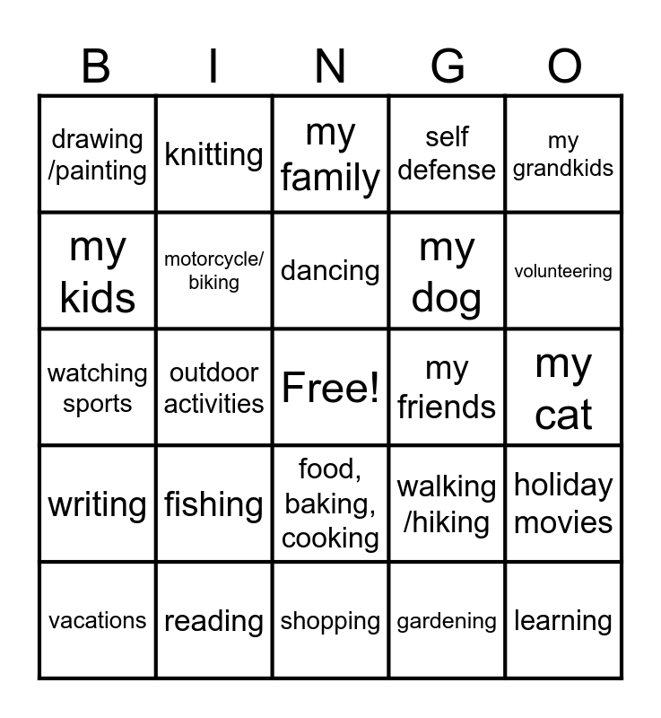 This bingo card has a free space and 24 words: fishing, reading, dancing, vacations, my grandkids, drawing /painting, my kids, knitting, my friends, food, baking, cooking, my dog, watching sports, walking /hiking, holiday movies, motorcycle/ biking, gardening, my cat, my family, volunteering, outdoor activities, learning, writing, self defense and shopping.