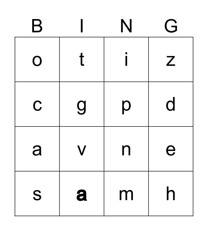 This bingo card has 16 words: a, e, i, o, a, t, n, m, c, g, s, z, v, d, p and h.