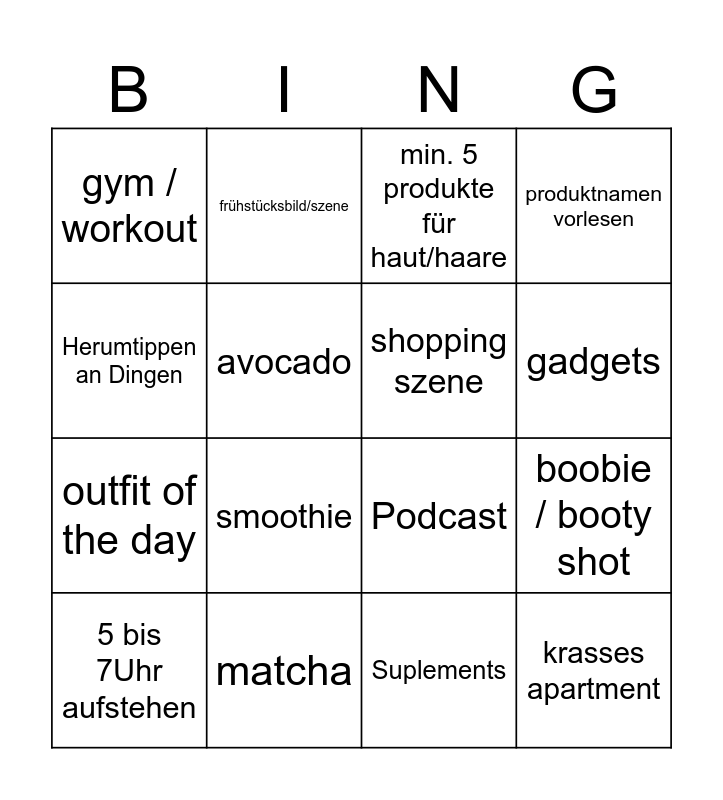 This bingo card has 16 words: matcha, boobie / booty shot, min. 5 produkte für haut/haare, gym / workout, outfit of the day, frühstücksbild/szene, Podcast, Suplements, Herumtippen an Dingen, avocado, 5 bis 7Uhr aufstehen, produktnamen vorlesen, smoothie, gadgets, shopping szene and krasses apartment.