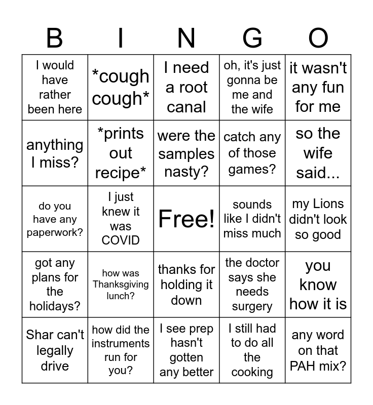 This bingo card has a free space and 24 words: how was Thanksgiving lunch?, how did the instruments run for you?, were the samples nasty?, Shar can't legally drive, it wasn't any fun for me, I would have rather been here, anything I miss?, *cough cough*, sounds like I didn't miss much, thanks for holding it down, catch any of those games?, do you have any paperwork?, the doctor says she needs surgery, you know how it is, *prints out recipe*, I still had to do all the cooking, my Lions didn't look so good, I need a root canal, so the wife said..., I just knew it was COVID, any word on that PAH mix?, got any plans for the holidays?, oh, it's just gonna be me and the wife and I see prep hasn't gotten any better.