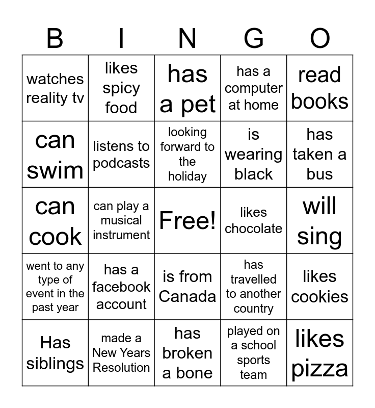 This bingo card has a free space and 29 words: Has siblings, has used zoom, can play a musical instrument, will travel, watches reality tv, has a pet, listens to podcasts, has a facebook account, likes chocolate, made a New Years Resolution, will sing, likes pizza, has broken a bone, played on a school sports team, has taken a bus, has seen a Star Wars firm, is from Canada, went to any type of event in the past year, read books, can cook, has travelled to another country, has gone apple picking, is wearing black, can swim, has a computer at home, likes spicy food, likes cookies, looking forward to the holiday and will participate in an escape room.