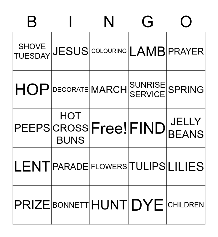 This bingo card has a free space and 30 words: BONNETT, CHOCOLATE, HOT CROSS BUNS, HOPE, SHOVE TUESDAY, COLOURING, DECORATE, FLOWERS, FIND, HUNT, JELLY BEANS, CHILDREN, DYE, RABBITS, SPRING, SWEETS, TULIPS, LENT, PARADE, PRAYER, PEEPS, EGGS, JESUS, SUNRISE SERVICE, HOP, LAMB, LILIES, PRIZE, MARCH and FAITH.