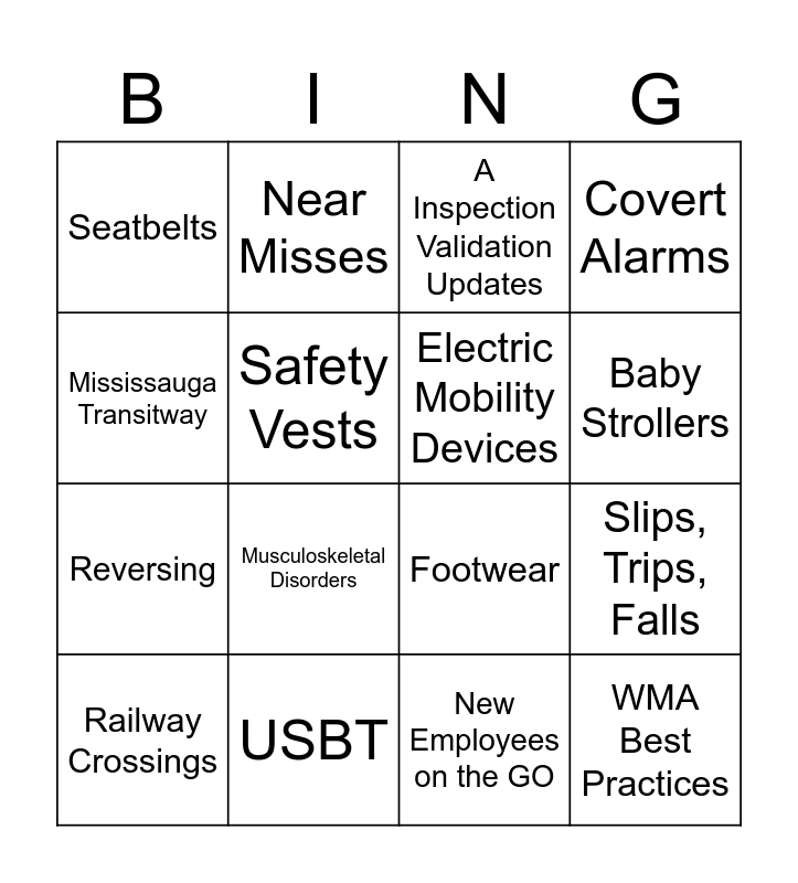 This bingo card has 16 words: USBT, Slips, Trips, Falls, A Inspection Validation Updates, Seatbelts, Reversing, Near Misses, Footwear, New Employees on the GO, Mississauga Transitway, Safety Vests, Railway Crossings, Covert Alarms, Musculoskeletal Disorders, Baby Strollers, Electric Mobility Devices and WMA Best Practices.