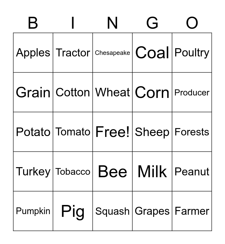 This bingo card has a free space and 24 words: Tobacco, Pig, Wheat, Pumpkin, Poultry, Apples, Grain, Tractor, Sheep, Bee, Corn, Potato, Milk, Peanut, Cotton, Grapes, Forests, Chesapeake, Producer, Tomato, Farmer, Turkey, Coal and Squash.