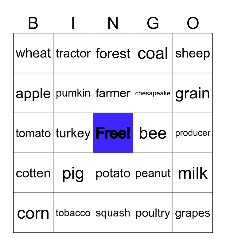 This bingo card has a free space and 24 words: pig, tobacco, farmer, corn, sheep, wheat, apple, tractor, bee, potato, chesapeake, tomato, peanut, milk, pumkin, poultry, producer, forest, grain, turkey, grapes, cotten, coal and squash.