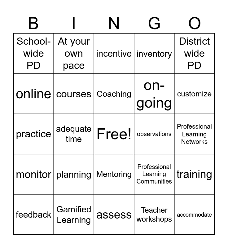 This bingo card has a free space and 26 words: Mentoring, Teacher workshops, Coaching, Gamified Learning, District wide PD, School-wide PD, online, At your own pace, Professional Learning Networks, Professional Learning Communities, on-going, practice, training, feedback, adequate time, new strategies, inventory, monitor, incentive, accommodate, customize, assess, observations, planning, courses and expertise.