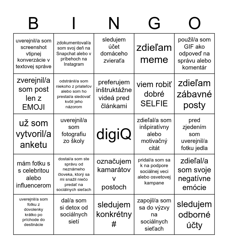 This bingo card has a free space and 24 words: dostal/a som ste správu od neznámeho človeka, ktorý sa mi snažil niečo predať na sociálnych sieťach, dal/a som si detox od sociálnych sietí, preferujem inštruktážne videá pred článkami, uverejnil/a som fotku z dovolenky krátko po príchode do destinácie, použil/a som GIF ako odpoveď na správu alebo komentár, uverejnil/a som screenshot vtipnej konverzácie v textovej správe, zverejnil/a som post len z EMOJI, zdokumentoval/a som svoj deň na Snapchat alebo v príbehoch na Instagram, zdieľal/a som inšpiratívny alebo motivačný citát, označujem kamarátov v postoch, viem robiť dobré SELFIE, už som vytvoril/a anketu, pridal/a som sa k na podpore sociálnej veci alebo osvetovej kampane, zdieľal/a som svoje negatívne emócie, odstránil/a som niekoho z priateľov alebo som ho prestal/a sledovať kvôli jeho názorom, zapojil/a som sa do výzvy na sociálnych sieťach, pred zjedením som uverejnil/a fotku jedla, sledujem účet domáceho zvieraťa, zdieľam zábavné posty, uverejnil/a som fotografiu zo školy, sledujem odborné účty, mám fotku s s celebritou alebo influencerom, zdieľam meme and sledujem konkrétny #.