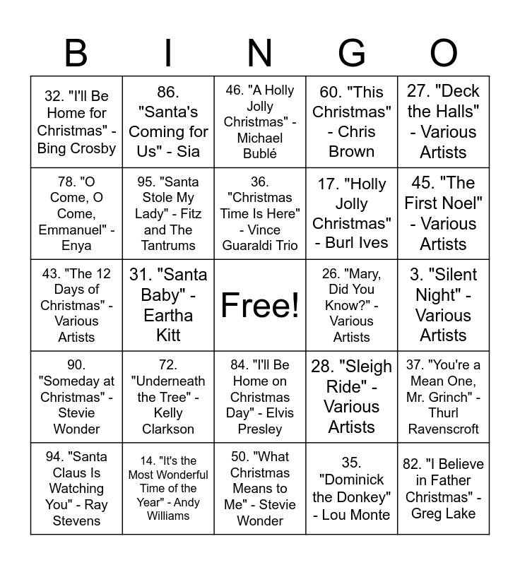 This bingo card has a free space and 100 words: 1. "White Christmas" - Bing Crosby, 2. "Jingle Bells" - Various Artists, 3. "Silent Night" - Various Artists, 4. "All I Want for Christmas Is You" - Mariah Carey, 5. "The Christmas Song (Chestnuts Roasting on an Open Fire)" - Nat King Cole, 6. "Have Yourself a Merry Little Christmas" - Judy Garland, 7. "Feliz Navidad" - Jose Feliciano, 8. "Last Christmas" - Wham!, 9. "Rudolph the Red-Nosed Reindeer" - Gene Autry, 10. "Winter Wonderland" - Various Artists, 11. "Santa Claus Is Coming to Town" - Bruce Springsteen, 12. "Let It Snow! Let It Snow! Let It Snow!" - Dean Martin, 13. "Rockin' Around the Christmas Tree" - Brenda Lee, 14. "It's the Most Wonderful Time of the Year" - Andy Williams, 15. "O Holy Night" - Various Artists, 16. "Christmas (Baby Please Come Home)" - Darlene Love, 17. "Holly Jolly Christmas" - Burl Ives, 18. "Frosty the Snowman" - Jimmy Durante, 19. "Do They Know It's Christmas?" - Band Aid, 20. "Blue Christmas" - Elvis Presley, 21. "Wonderful Christmastime" - Paul McCartney, 22. "Silver Bells" - Various Artists, 23. "I Saw Mommy Kissing Santa Claus" - Jimmy Boyd, 24. "Happy Xmas (War Is Over)" - John Lennon, Yoko Ono, 25. "Christmas in Hollis" - Run-DMC, 26. "Mary, Did You Know?" - Various Artists, 27. "Deck the Halls" - Various Artists, 28. "Sleigh Ride" - Various Artists, 29. "Carol of the Bells" - Various Artists, 30. "Little Drummer Boy" - Various Artists, 31. "Santa Baby" - Eartha Kitt, 32. "I'll Be Home for Christmas" - Bing Crosby, 33. "Grandma Got Run Over by a Reindeer" - Elmo & Patsy, 34. "This Christmas" - Donny Hathaway, 35. "Dominick the Donkey" - Lou Monte, 36. "Christmas Time Is Here" - Vince Guaraldi Trio, 37. "You're a Mean One, Mr. Grinch" - Thurl Ravenscroft, 38. "Jingle Bell Rock" - Bobby Helms, 39. "Do You Hear What I Hear?" - Various Artists, 40. "Santa Claus Is a Black Man" - Akim & Teddy Vann, 41. "It's Beginning to Look a Lot Like Christmas" - Perry Como, 42. "Grown-Up Christmas List" - Amy Grant, 43. "The 12 Days of Christmas" - Various Artists, 44. "Where Are You Christmas?" - Faith Hill, 45. "The First Noel" - Various Artists, 46. "A Holly Jolly Christmas" - Michael Bublé, 47. "Peace on Earth/Little Drummer Boy" - David Bowie & Bing Crosby, 48. "Please Come Home for Christmas" - Eagles, 49. "Santa Tell Me" - Ariana Grande, 50. "What Christmas Means to Me" - Stevie Wonder, 51. "Christmas Wrapping" - The Waitresses, 52. "Believe" - Josh Groban, 53. "Silver and Gold" - Burl Ives, 54. "Christmas Is the Time to Say I Love You" - Billy Squier, 55. "We Need a Little Christmas" - Angela Lansbury (from Mame), 56. "Must Be Santa" - Bob Dylan, 57. "Mistletoe" - Justin Bieber, 58. "Step into Christmas" - Elton John, 59. "Hard Candy Christmas" - Dolly Parton, 60. "This Christmas" - Chris Brown, 61. "Merry Christmas, Darling" - The Carpenters, 62. "I Want a Hippopotamus for Christmas" - Gayla Peevey, 63. "Christmas Lights" - Coldplay, 64. "Marshmallow World" - Darlene Love, 65. "Run Rudolph Run" - Chuck Berry, 66. "Christmas (Baby Please Come Home)" - U2, 67. "What's This?" - Danny Elfman (from The Nightmare Before Christmas), 68. "Snow Miser/Heat Miser Song" - The Year Without a Santa Claus, 69. "My Favorite Things" - Julie Andrews (from The Sound of Music), 70. "Christmas Vacation" - Mavis Staples (from National Lampoon's Christmas Vacation), 71. "Pretty Paper" - Roy Orbison, 72. "Underneath the Tree" - Kelly Clarkson, 73. "All I Want for Christmas Is a Real Good Tan" - Kenny Chesney, 74. "Christmas Shoes" - NewSong, 75. "Light of the World" - Lauren Daigle, 76. "Christmas Island" - Jimmy Buffett, 77. "Jingle Bell Rock" - Hall & Oates, 78. "O Come, O Come, Emmanuel" - Enya, 79. "Happy Holiday/The Holiday Season" - Andy Williams, 80. "Thank God It's Christmas" - Queen, 81. "One More Sleep" - Leona Lewis, 82. "I Believe in Father Christmas" - Greg Lake, 83. "Christmas Through Your Eyes" - Gloria Estefan, 84. "I'll Be Home on Christmas Day" - Elvis Presley, 85. "The Man with All the Toys" - The Beach Boys, 86. "Santa's Coming for Us" - Sia, 87. "Christmas Day" - Michael W. Smith, 88. "What Are You Doing New Year's Eve?" - Ella Fitzgerald, 89. "Happy New Year" - ABBA, 90. "Someday at Christmas" - Stevie Wonder, 91. "Last Christmas" - Taylor Swift, 92. "Santa Claus Go Straight to the Ghetto" - James Brown, 93. "Christmas in Harlem" - Kanye West, 94. "Santa Claus Is Watching You" - Ray Stevens, 95. "Santa Stole My Lady" - Fitz and The Tantrums, 96. "My Only Wish (This Year)" - Britney Spears, 97. "Hardrock, Coco and Joe" - Various Artists, 98. "Christmas (Baby Please Come Home)" - Death Cab for Cutie, 99. "Winter Things" - Ariana Grande and 100. "We Wish You a Merry Christmas" - Various Artists.