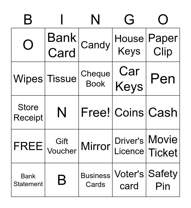 This bingo card has a free space and 30 words: B, I, N, G, O, Candy, Tissue, Mirror, Coins, Business Cards, Cash, Safety Pin, Voter's card, Gift Card, Pen, Cell Phone, Driver's Licence, FREE, Gift Voucher, Paper Clip, Store Receipt, Health Insurance Card, Bank Card, Car Keys, Wipes, House Keys, Movie Ticket, Bank Statement, Cheque Book and Garbage.
