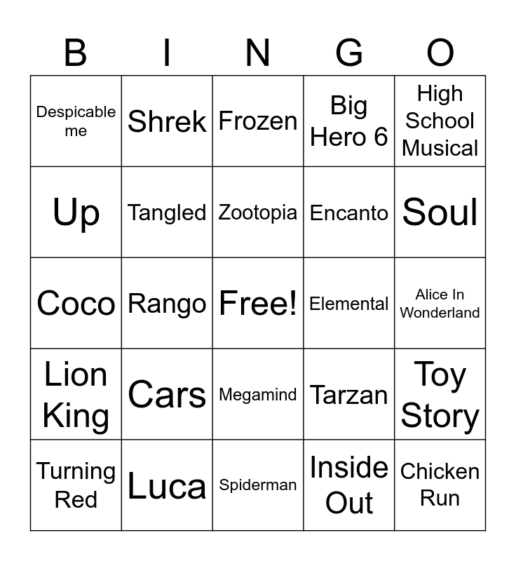This bingo card has a free space and 28 words: Toy Story, Incredibles, Encanto, Inside Out, Up, Frozen, Shrek, Lion King, Elemental, Turning Red, Coco, Big Hero 6, Luca, Spiderman, Soul, Moana, Cars, Tangled, Zootopia, Megamind, Despicable me, Ice Age, Chicken Run, Rango, Alice In Wonderland, Tarzan, High School Musical and Cloudy with a Chance of Meatballs.