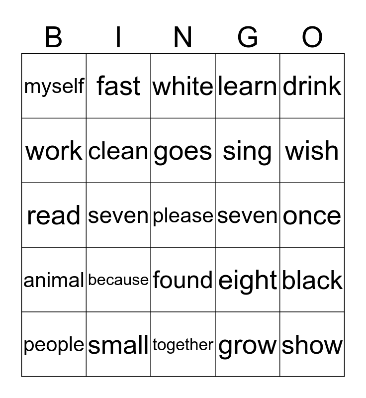 This bingo card has a free space and 24 words: because, small, goes, people, drink, myself, work, fast, seven, found, sing, read, eight, black, clean, grow, once, white, wish, seven, show, animal, learn and together.