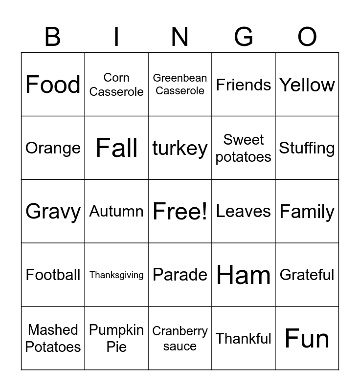 This bingo card has a free space and 24 words: Thanksgiving, Pumpkin Pie, turkey, Mashed Potatoes, Yellow, Food, Orange, Corn Casserole, Leaves, Parade, Sweet potatoes, Gravy, Ham, Grateful, Fall, Thankful, Family, Greenbean Casserole, Stuffing, Autumn, Fun, Football, Friends and Cranberry sauce.