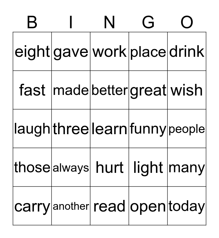 This bingo card has a free space and 24 words: always, another, better, carry, drink, eight, fast, gave, funny, hurt, great, laugh, light, many, made, open, people, work, wish, three, today, those, place and read.