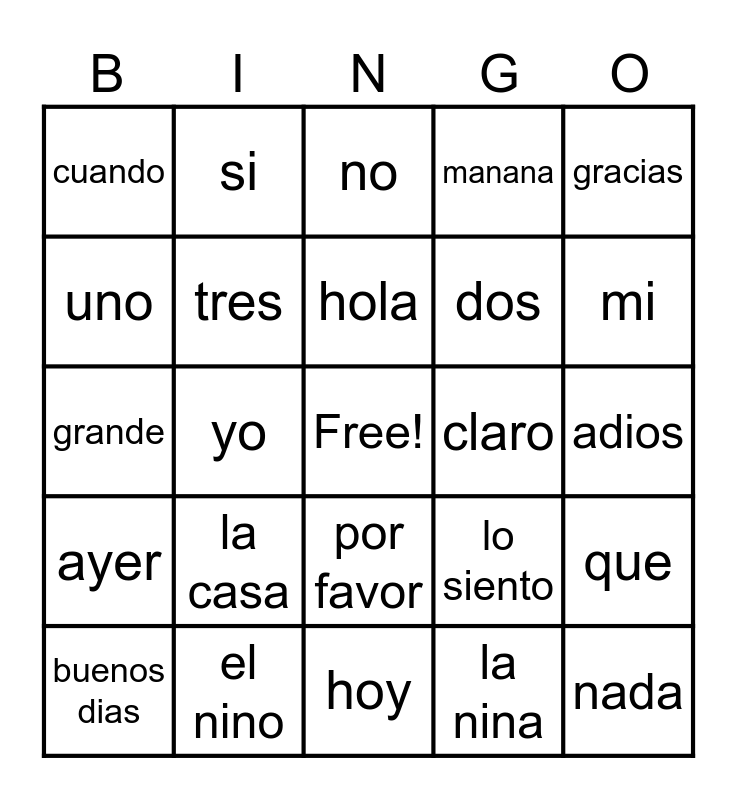 This bingo card has a free space and 24 words: la casa, el nino, hola, buenos dias, gracias, cuando, uno, si, claro, por favor, dos, grande, lo siento, que, tres, la nina, adios, no, mi, yo, nada, ayer, manana and hoy.
