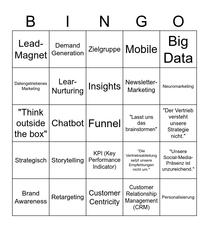 This bingo card has 101 words: Free!, Synergie, Big Data, Omnichannel, Digitalisierung, Machine Learning, Native Advertising, Targeting, Operativ, Wachstum, Vision, Mission, Kernkompetenz, Positionierung, USP, Alleinstellungsmerkmal, Strategisch, Taktisch, Gamification, Content is King, Distribution, Nachhaltigkeit, Agile Marketing, Augmented Reality (AR), Customer Engagement, Neuromarketing, Mobile, Storytelling, Virales Marketing, Guerilla Marketing, Demand Generation, Zielgruppe, Customer Journey, Branding, Conversion-Rate, KPI (Key Performance Indicator), ROI (Return on Investment), User Experience (UX), Customer Relationship Management (CRM), Customer Centricity, Crossmediale Kampagnen, Brand Awareness, Lead-Generierung, Social-Media-Strategie, Markenstrategie, Funnel, Performance Marketing, SEO & SEA, Content-Marketing, Personalisierung, Individualisierung, Datengetriebenes Marketing, Kampagnen, Corporate Identity, Lead-Nurturing, Webinar-Engagement, Conversion-Optimierung, Social-Selling, Best Practice Benchmark, Lead-Scoring, Lear-Nurturing, Meilenstein, Influencer-Marketing, Kundenakquise, E-Mail-Marketing, Newsletter-Marketing, User-Generated Content, Chatbot, Retargeting, Community-Management, Social-Media-Trends, CRM-Integration, Lead-Magnet, Social-Listening, Insights, "Think outside the box", "Am Ball bleiben", "Win-win-Situation", "Das ist ein Game-Changer", "Wir müssen skalieren", "Low-hanging fruits", "Das ist ein No-Brainer", "Lasst uns das brainstormen", "Das ist ein Quick Win", "Synergien schaffen", "Das ist ganzheitlich gedacht", "Der Vertrieb versteht unsere Strategie nicht.", "Uns fehlt eine klare langfristige Marketingstrategie.", "Es ist so schwierig, den ROI unserer Kampagnen genau zu messen.", "Wir haben wieder einmal nicht genug Budget für unsere Projekte.", "Die Vertriebsabteilung setzt unsere Empfehlungen nicht um.", "Niemand achtet auf die Kundenbedürfnisse.", "Wir brauchen mehr Ressourcen für Marktforschung.", "Unsere Wettbewerber sind uns immer einen Schritt voraus.", "Der Vertrieb gibt uns nie genaues Feedback.", "Unsere Social-Media-Präsenz ist unzureichend.", "Das Rad neu erfinden", "Das bringt uns aufs nächste Level", "Das ist ein strategischer Ansatz", "Wir sollten unsere Prozesse optimieren" and "Unser Ansatz muss datengetrieben sein".